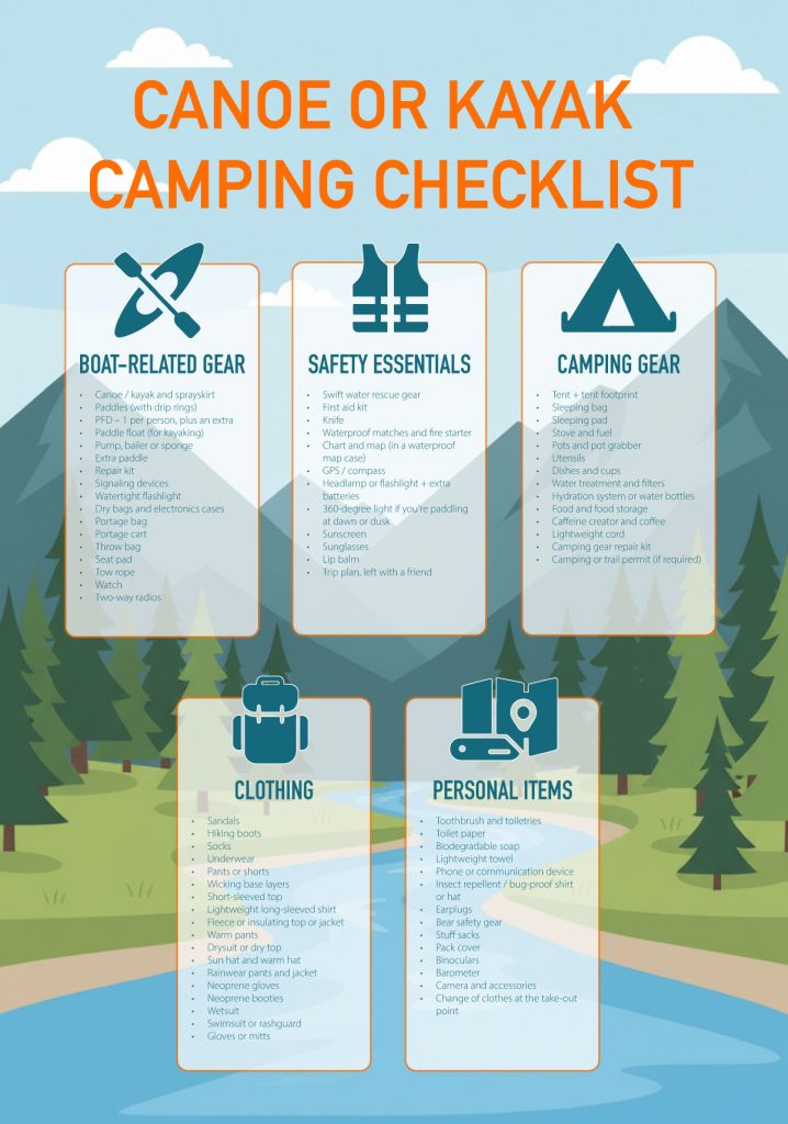 Things to consider packing are dry bags for keeping all your goods dry. Paddling gear such as lifejackets, throw ropes, paddles, etc. Necessary safety equipment such as first aid, navigation tools, and communication devices. Clothing for all weather, including warm layers and rain gear. It is best to avoid cotton as it can increase the risk of hypothermia when cold and wet. And finally, backcountry camping gear and cooking equipment. For more information, Mountain Equipment Company has compiled an in-depth list on their website that will help ensure you have everything you need: https://www.mec.ca/en/explore/canoe-or-kayak-touring-checklist.