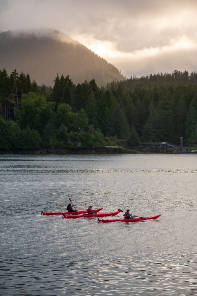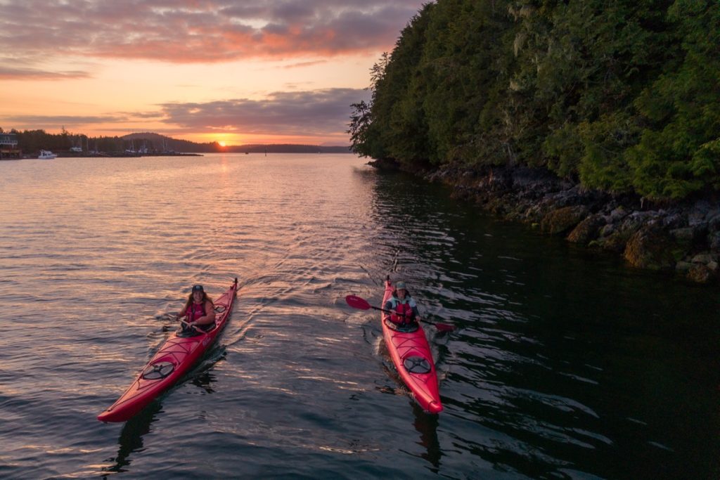 That evening, the glowing sunset pulled us back onto the water for one final paddle. We glided toward the steep islands of Leche Island, which has a traditional name of Caapiith (pronounced “chap eeth”), which means “middle of the bay” and refers to its location in Ucluelet Inlet. The ocean was calm and the horizon ablaze. There’s something magical about watching the sunset from a kayak. As I floated silently along on the water, I took a moment to reflect on the adventures we had enjoyed in Ucluelet so far and those to come.