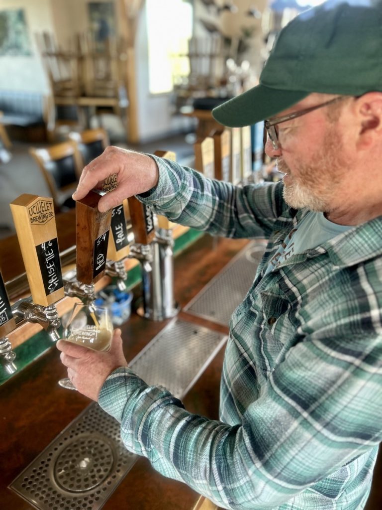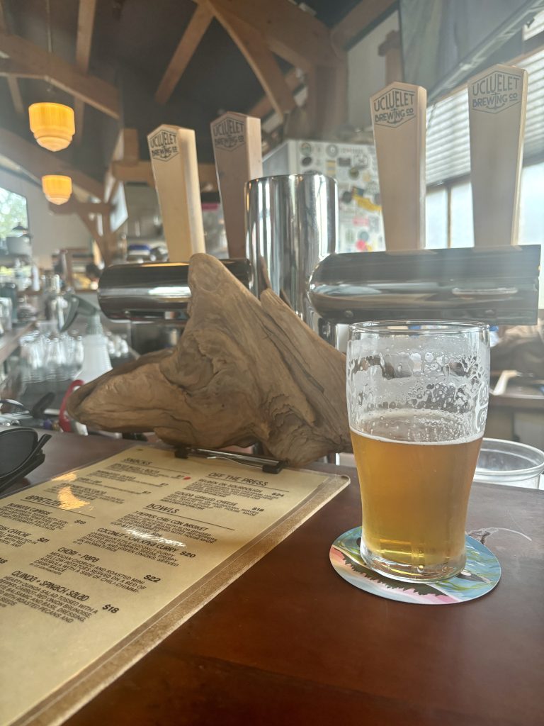 Our first stop was the Ucluelet Brewing Company located in a renovated church just off the town’s Main Street. What a view! You step into this beautiful timber-framed building, with its sweeping bar that wraps around the restaurant, and are greeted by and a stunning backdrop of the ocean. I’m a sucker for IPAs, and the South Swell West Coast IPA was the perfect fit for a moody sunset.