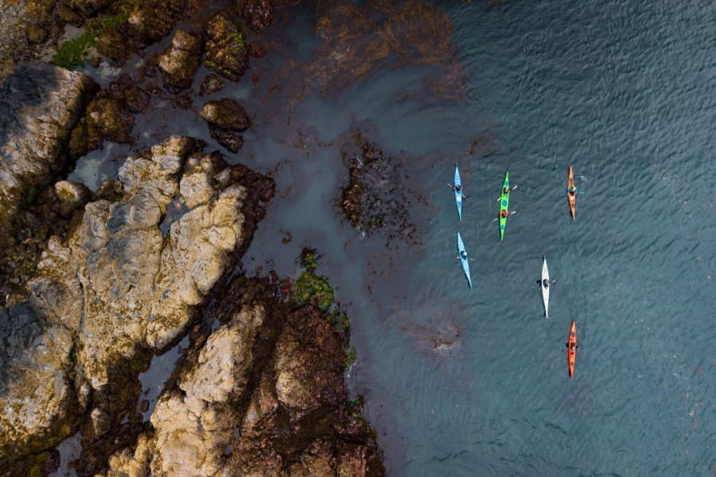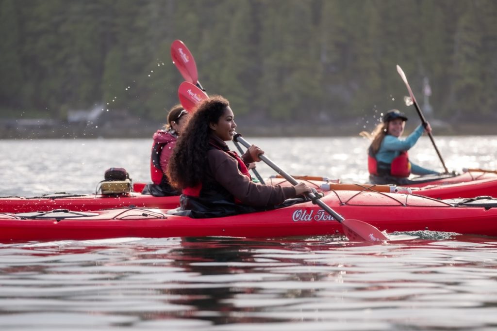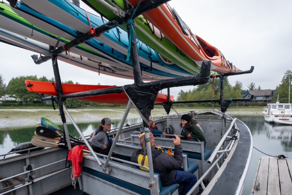 The marina was misty in the early morning light, but clearer skies were waiting ahead. We boarded the water taxi and headed into a quiet cove where it was calm enough to launch. I chose a double kayak because ocean paddling can feel intimidating, even for someone like me who is confident on a paddleboard and raft. The swells can still be daunting.